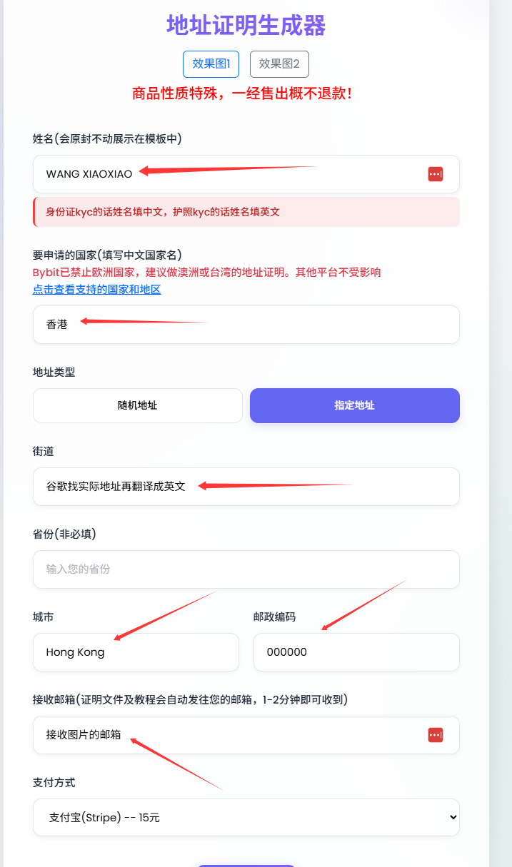 谷歌地图搜索一个真实地址,然后翻译成英文,再用上面的地址生成器生成。香港的邮编是 000000